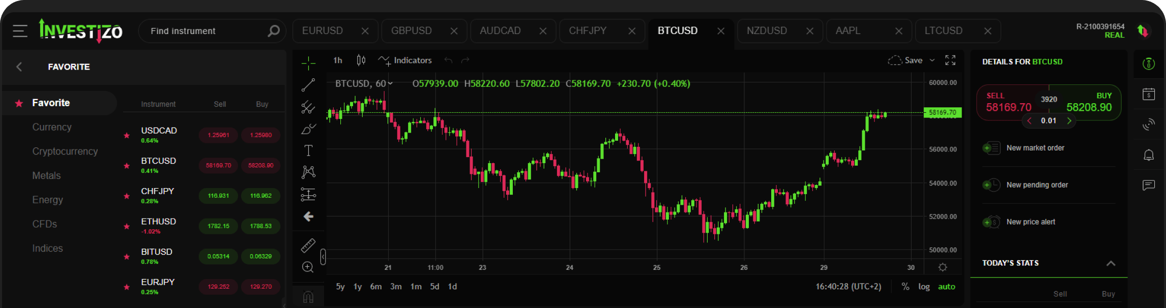 Investizo provides access to the following account types: REAL ECN, REAL STANDARD with the highest quality service and trading conditions.